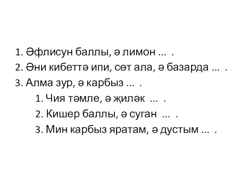 1. Әфлисун баллы, ә лимон ... .2. Әни кибеттә ипи, сөт ала, ә базарда ... .3. Алма