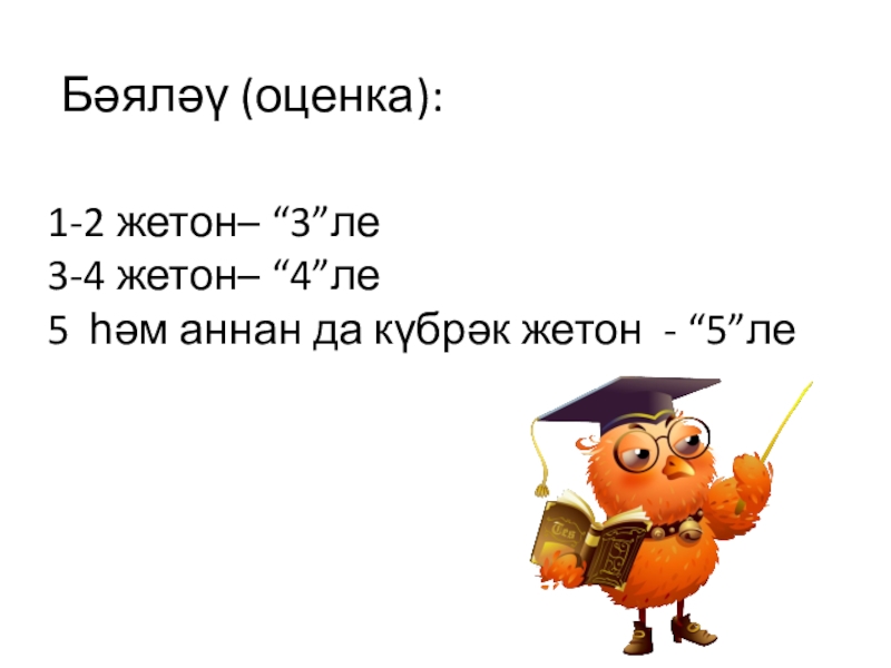 Бәяләү (оценка):1-2 жетон– “3”ле3-4 жетон– “4”ле5 һәм аннан да күбрәк жетон - “5”ле