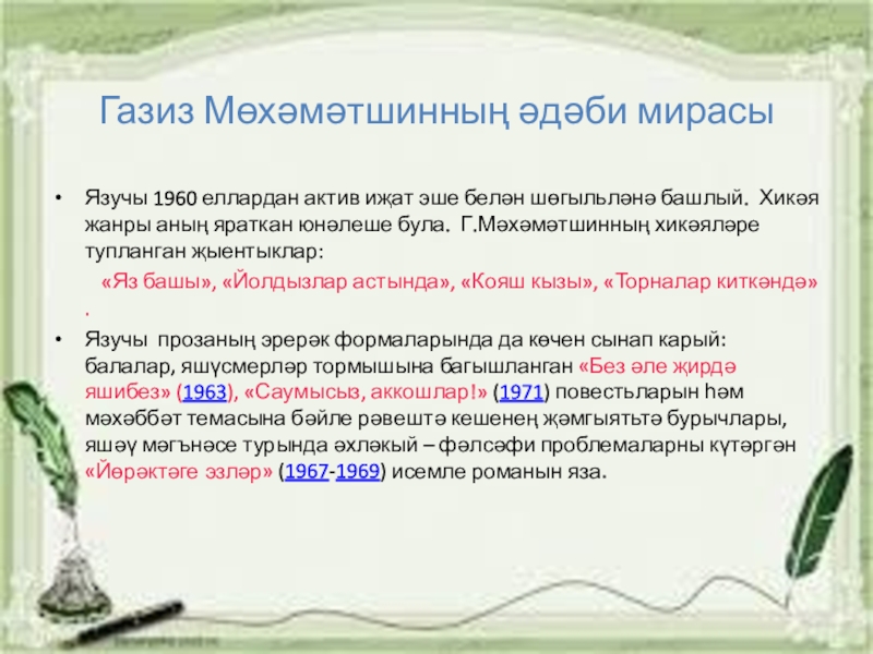 Слайд 6Газиз Мөхәмәтшинның әдәби мирасы