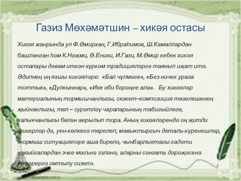 Слайд 7Газиз Мөхәмәтшин – хикәя остасы