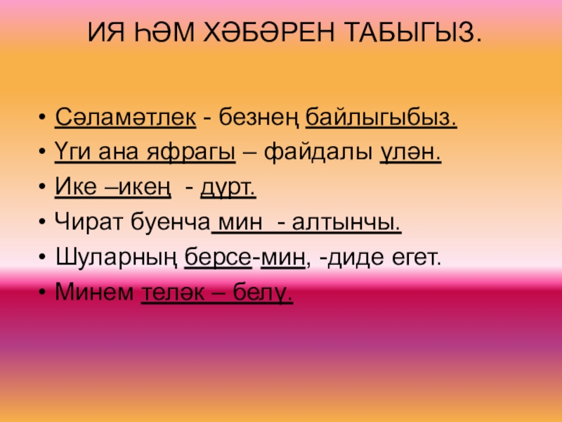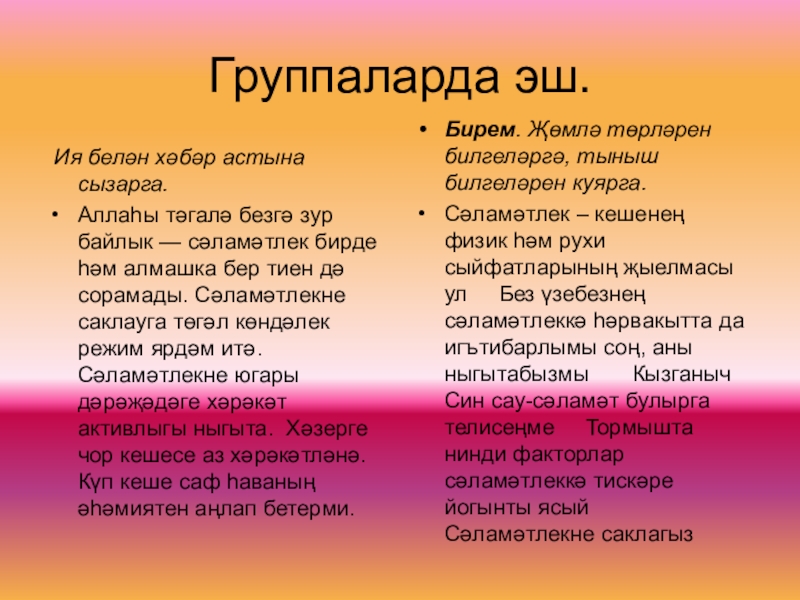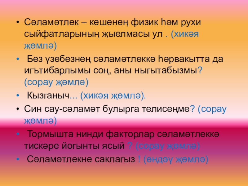Сәламәтлек – кешенең физик һәм рухи сыйфатларының җыелмасы ул Без үзебезнең сәламәтлеккә һәрвакытта да игътибарлымы соң, аны ныгытабызмы Кызганыч Син сау-сәламәт булырга телисеңме Тормышта нинди факторлар сәламәтлеккә тискәре йогынты ясый Сәламәтлекне саклагыз