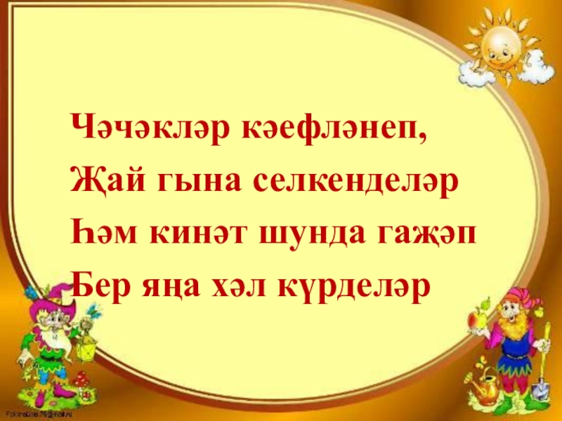 Чәчәкләр кәефләнеп,Җай гына селкенделәрҺәм кинәт шунда гаҗәпБер яңа хәл күрделәр