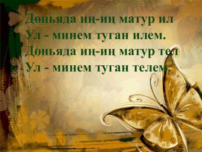 Дөньяда иң-иң матур илУл - минем туган илем.Дөньяда иң-иң матур телУл - минем туган телем.