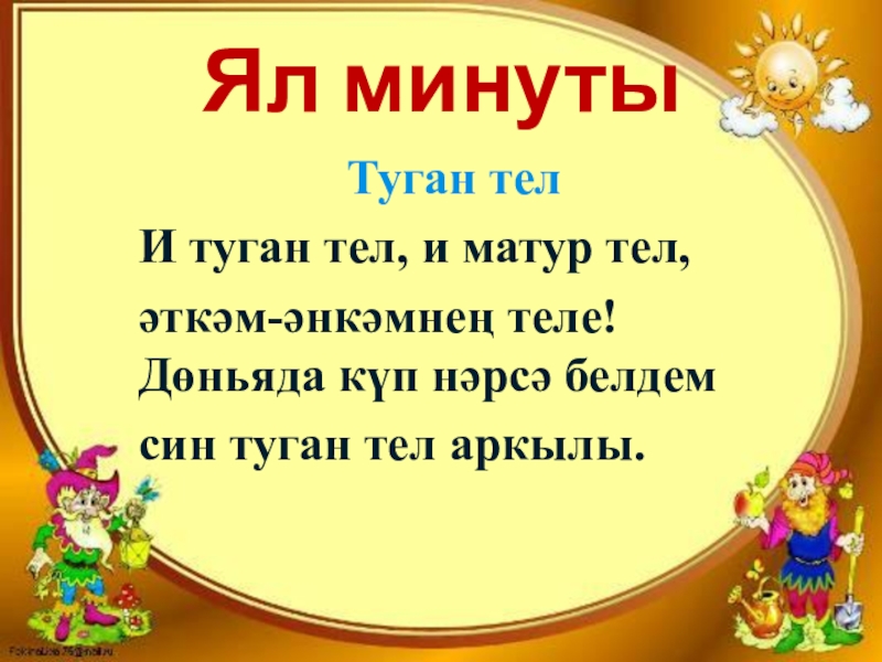 Ял минутыТуган тел    И туган тел, и матур тел,    әткәм-әнкәмнең теле!