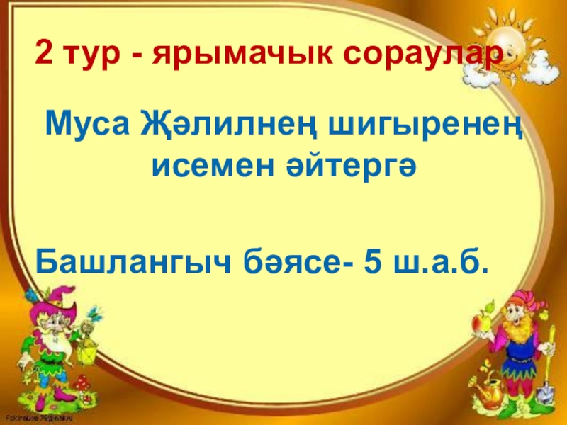 2 тур - ярымачык сораулар Муса Җәлилнең шигыренең исемен әйтергәБашлангыч бәясе- 5 ш.а.б.