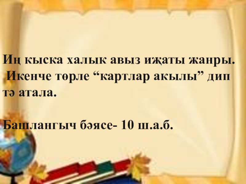 Иң кыска халык авыз иҗаты жанры. Икенче төрле “картлар акылы” дип тә атала.Башлангыч бәясе- 10 ш.а.б.