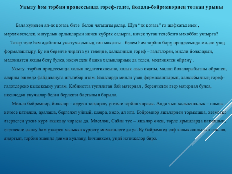 Слайд 16Укыту һәм тәрбия процессында гореф-гадәт, йолала-бәйрәмнәрнең тоткан урыны