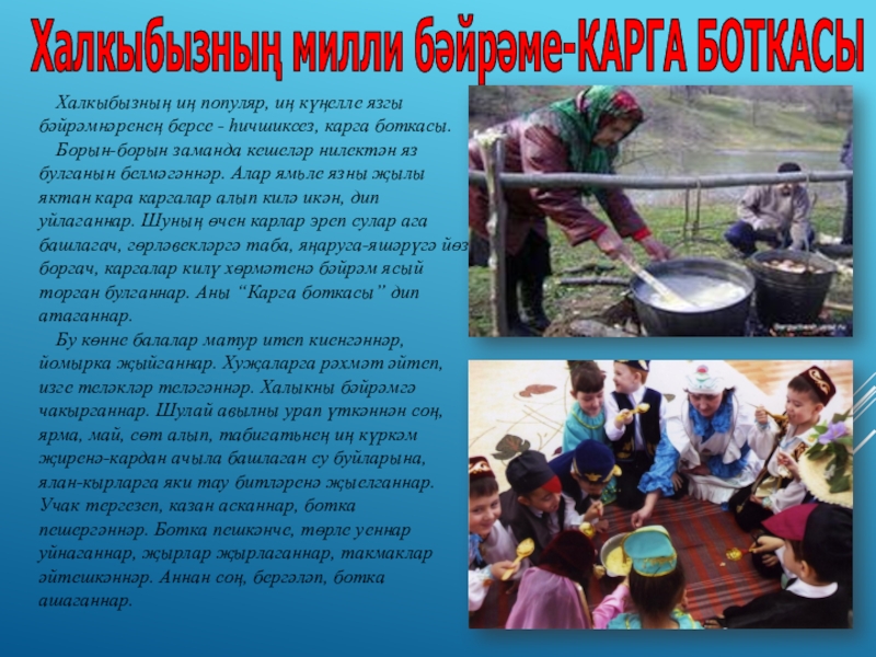 Слайд 4Халкыбызның иң популяр, иң күңелле язгы бәйрәмнәренең берсе - һичшиксез, карга