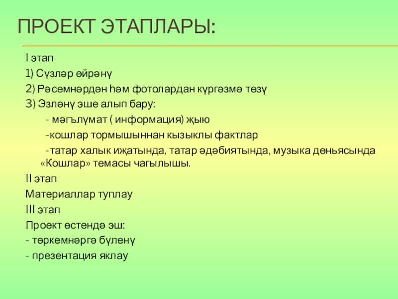 Проект этаплары:  I этап1) Сүзләр өйрәнү2) Рәсемнәрдән һәм фотолардан күргәзмә төзү3) Эзләнү эше алып бару:	- мәгълүмат
