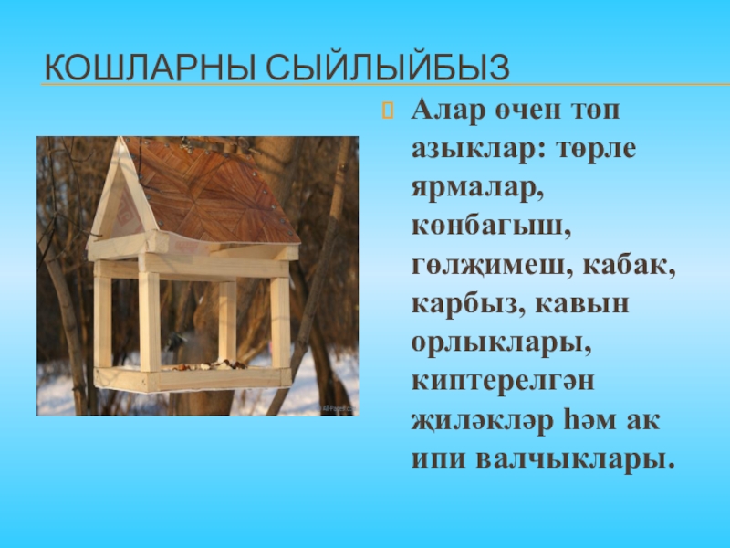 Кошларны сыйлыйбызАлар өчен төп азыклар: төрле ярмалар, көнбагыш, гөлҗимеш, кабак, карбыз, кавын орлыклары, киптерелгән җиләкләр һәм ак