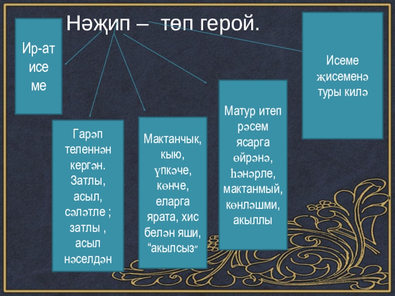 Мактанчык, кыю, үпкәче, көнче, еларга ярата, хис белән яши, “акылсыз”