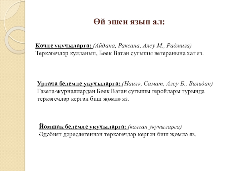 Уртача белемле укучыларга: (Наилә, Самат, Алсу Б., Вильдан)