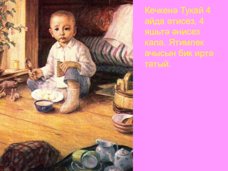 Слайд 3Кечкенә Тукай 4 айда әтисез, 4 яшьтә әнисез кала. Ятимлек ачысын