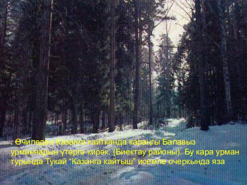 Слайд 55. Өчиледән Казанга кайтканда караңгы Балавыз урманнарын үтәргә кирәк. (Биектау районы).