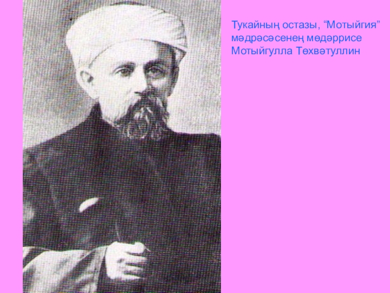Слайд 18Тукайның остазы, “Мотыйгия” мәдрәсәсенең мөдәррисе Мотыйгулла Төхвәтуллин