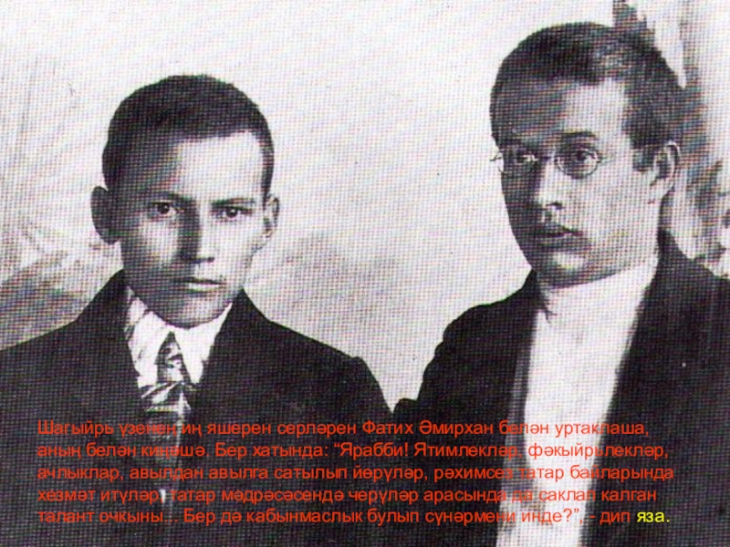 Слайд 39Шагыйрь үзенең иң яшерен серләрен Фатих Әмирхан белән уртаклаша, аның белән