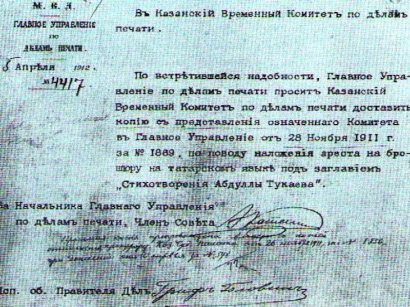 белән икәүләп киттек. Демонстрациягә тимер юл эшчесе Николай Покатилов җитәкчелек итте. Иске собор янында кызыл байрак күтәрделәр: таякка тагылган кызыл материя байракта сүзләр: “Яшәсен Беренче май – хезмәт бәйрәме!”. Чаган елгасы буенда безнең юлны атлы казаклар кистеләр... Без Тукай белән прокламацияләрне шәһәр уртасында ябыштырып йөрдек”. (А. Гладышев, “Уралец» типографиясе эшчесе. “Г. Тукаев турында истәлек”)