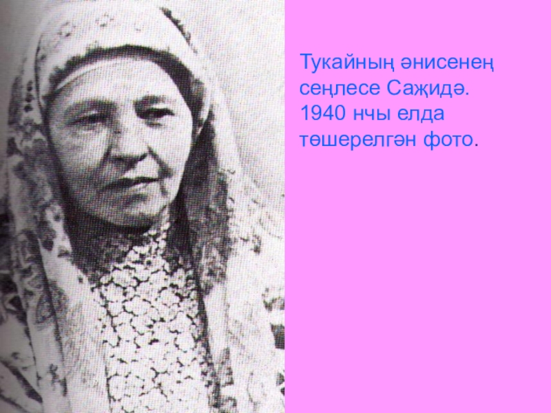 Слайд 7Тукайның әнисенең сеңлесе Саҗидә. 1940 нчы елда төшерелгән фото.
