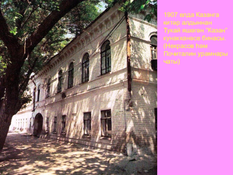 Слайд 231907 елда Казанга китәр алдыннан Тукай яшәгән “Казан” кунакханәсе бинасы. (Некрасов