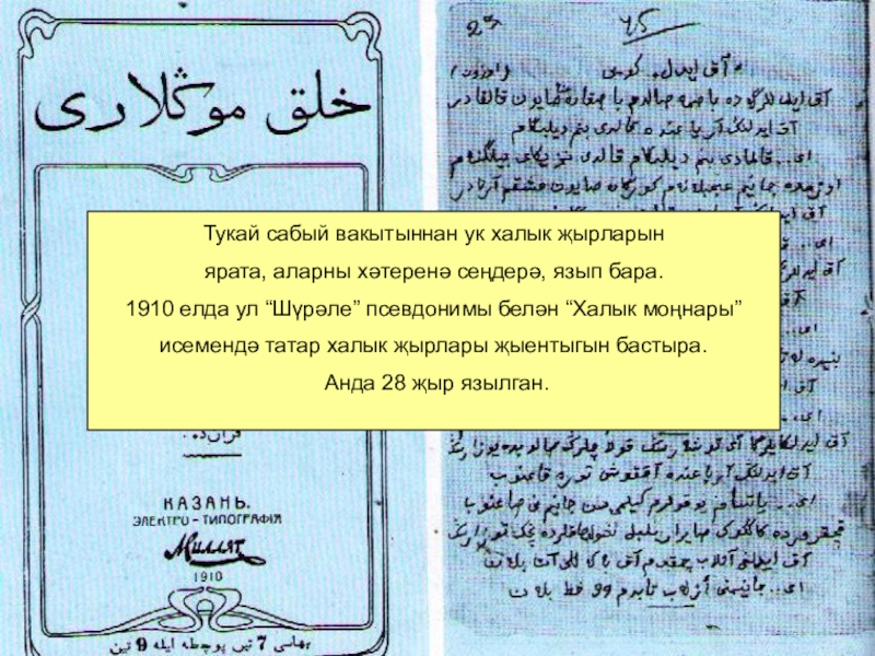 Слайд 44Тукай сабый вакытыннан ук халык җырларын