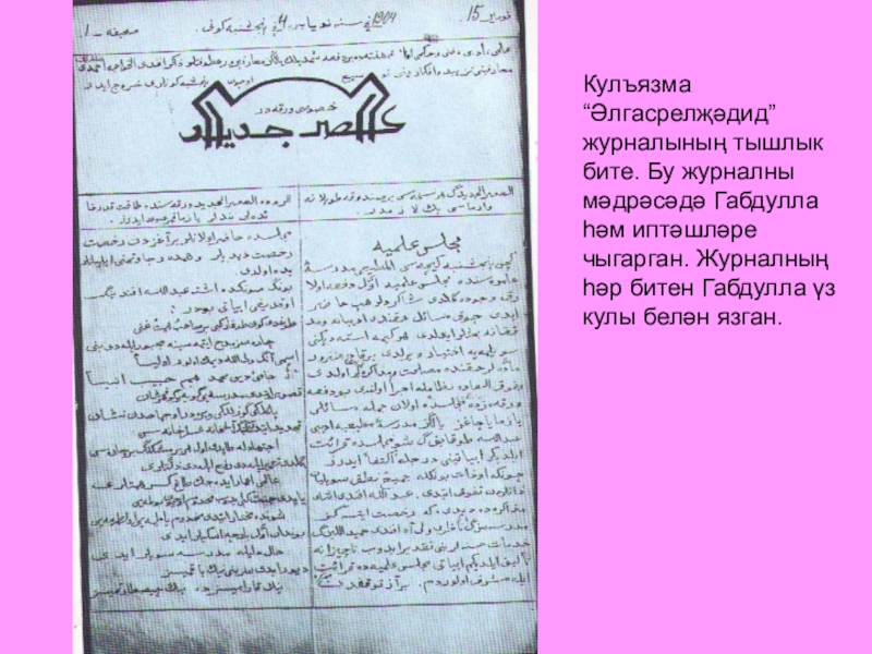 Слайд 20Кулъязма “Әлгасрелҗәдид” журналының тышлык бите. Бу журналны мәдрәсәдә Габдулла һәм иптәшләре