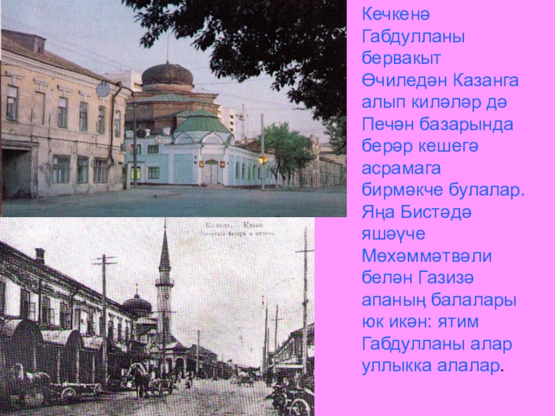 Слайд 8Кечкенә Габдулланы бервакыт Өчиледән Казанга алып киләләр дә Печән базарында берәр