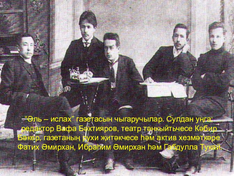 Слайд 37“Әль – ислах” газетасын чыгаручылар. Сулдан уңга: редактор Вафа Бәхтияров, театр