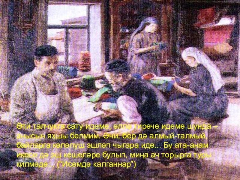 белмим. Әни, бер дә алмый-талмый, байларга кәләпүш эшләп чыгара иде... Бу ата-анам икесе дә эш кешеләре булып, миңа ач торырга туры килмәде... (“Исемдә калганнар”)