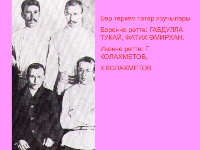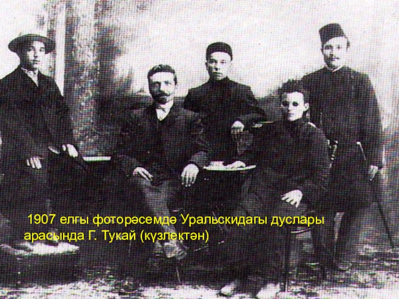 Слайд 24 1907 елгы фоторәсемдә Уральскидагы дуслары арасында Г. Тукай (күзлектән)