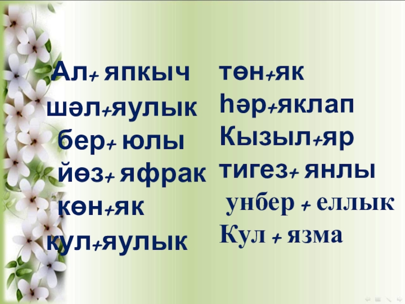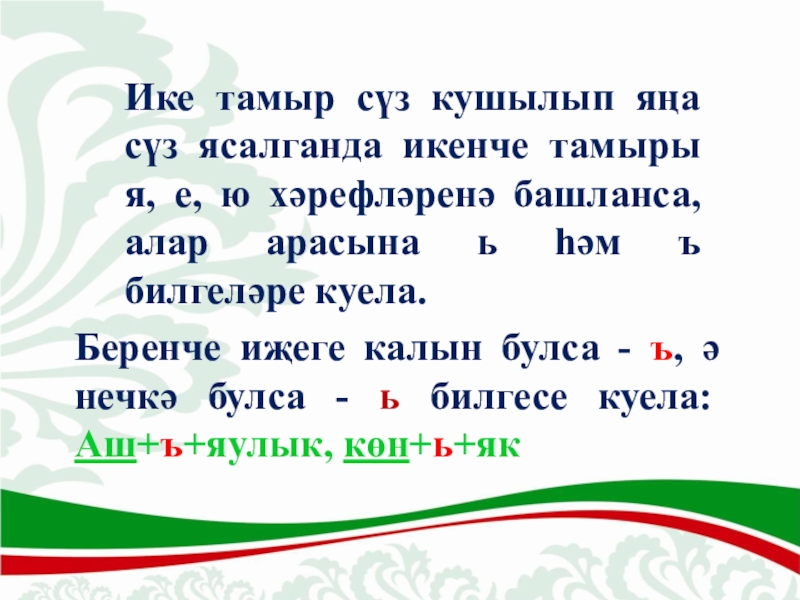 Беренче иҗеге калын булса - ъ, ә нечкә булса - ь билгесе куела: Аш+ъ+яулык, көн+ь+як