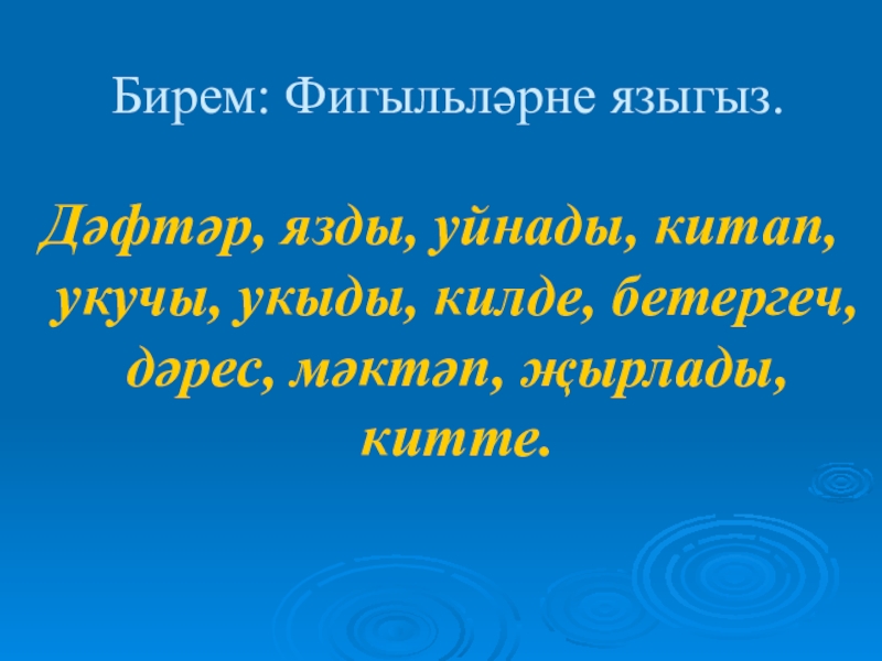 Бирем: Фигыльләрне языгыз.Дәфтәр, язды, уйнады, китап, укучы, укыды, килде, бетергеч, дәрес, мәктәп, җырлады, китте.