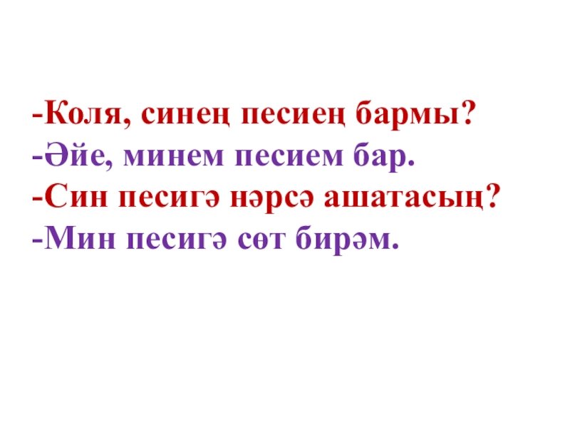 Коля, синең песиең бармы?Әйе, минем песием бар.Син песигә нәрсә ашатасың?Мин песигә сөт бирәм.