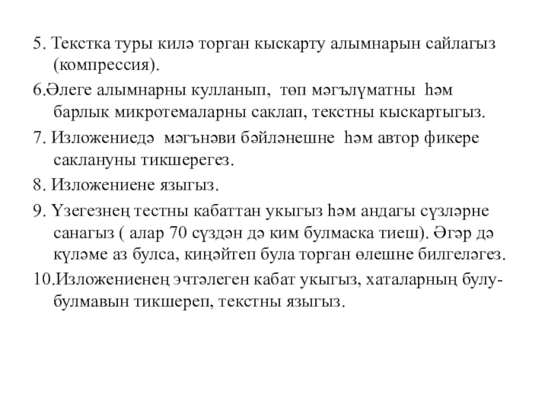 тапкыр укуга 3-4 минут, укылган текстны аңлауга 5 минут. Икенче кат укуга 3-4 минут вакыт бирелә. Изложение язу вакыты – 45 минут. Шуның 15-20 минутын бланкка күчереп язарга бүләргә кирәк.