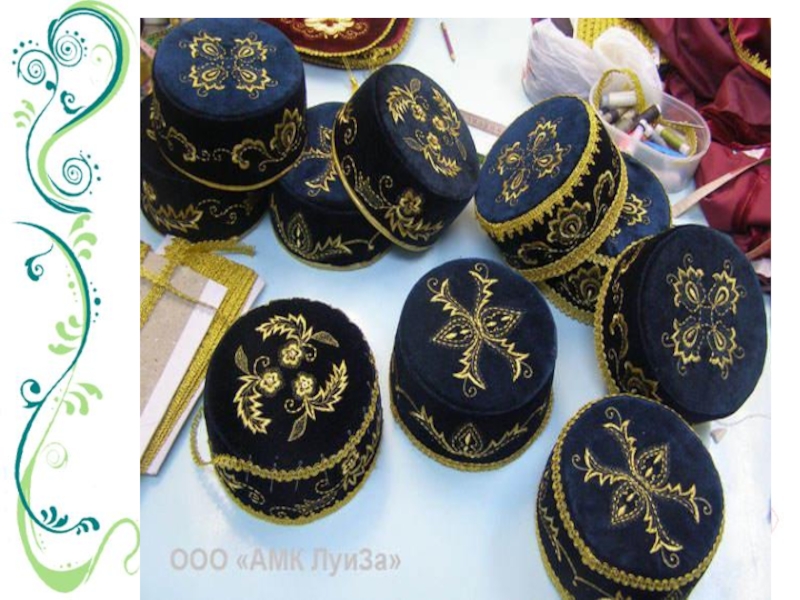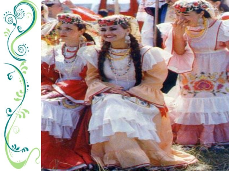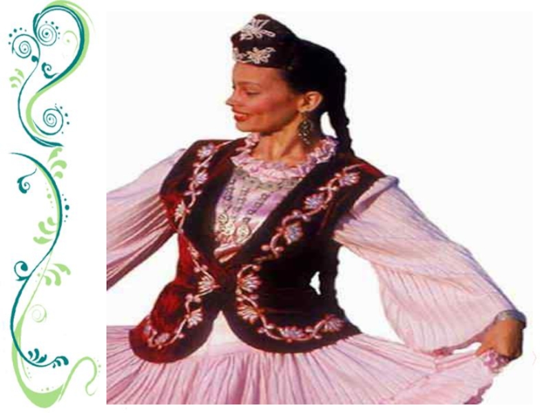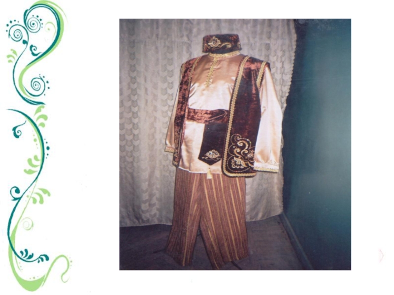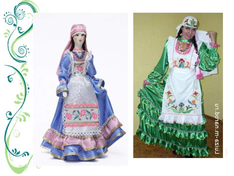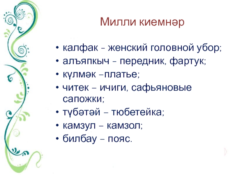 Милли киемнәркалфак - женский головной убор;алъяпкыч - передник, фартук;күлмәк –платье;читек – ичиги, сафьяновые сапожки;түбәтәй – тюбетейка;камзул –