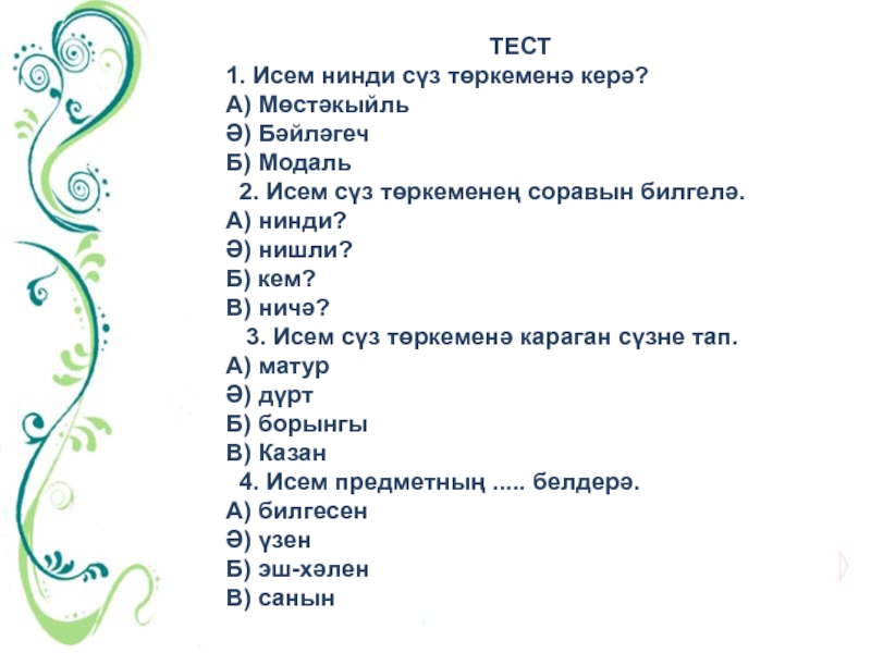 ТЕСТ1. Исем нинди сүз төркеменә керә?А) МөстәкыйльӘ) БәйләгечБ) Модаль 2. Исем сүз төркеменең соравын билгелә.А) нинди?Ә)