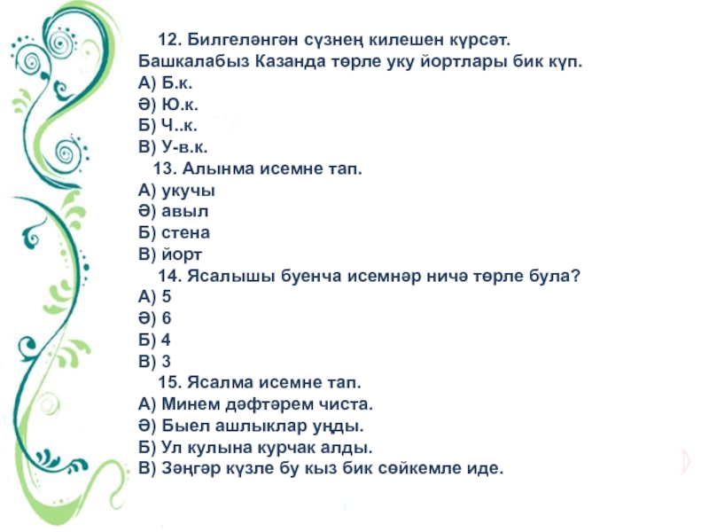 12. Билгеләнгән сүзнең килешен күрсәт.Башкалабыз Казанда төрле уку йортлары бик күп.А) Б.к.Ә) Ю.к.Б) Ч..к.В) У-в.к.