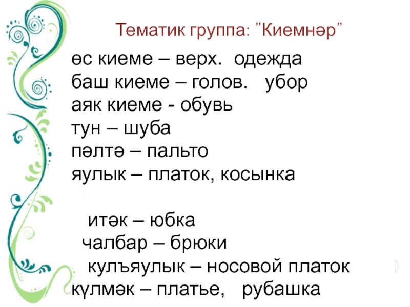 Тематик группа: ”Киемнәр”  өс киеме – верх. одеждабаш киеме – голов.  убораяк киеме - обувьтун –