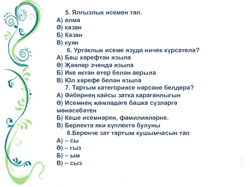 5. Ялгызлык исемен тап.А) алмаӘ) казанБ) КазанВ) куян   6. Уртаклык исеме язуда