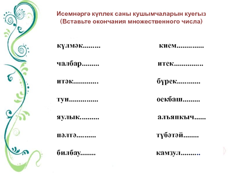 Слайд 13 Исемнәргә күплек саны кушымчаларын куегыз (Вставьте окончания множественного числа)