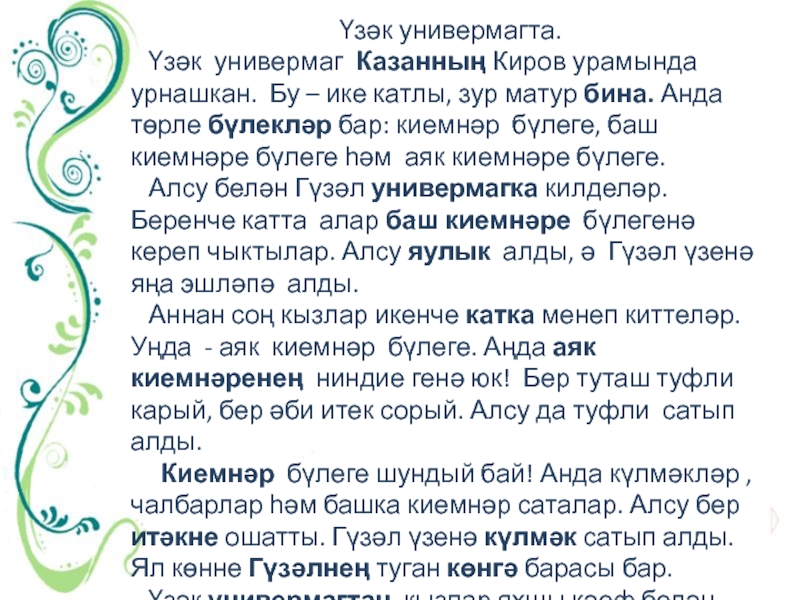 Киемнәр бүлеге шундый бай! Анда күлмәкләр , чалбарлар һәм башка киемнәр саталар. Алсу бер итәкне ошатты. Гүзәл үзенә күлмәк сатып алды. Ял көнне Гүзәлнең туган көнгә барасы бар.