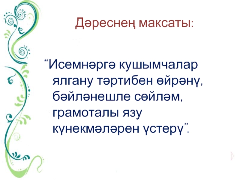 Дәреснең максаты: “Исемнәргә кушымчалар ялгану тәртибен өйрәнү, бәйләнешле сөйләм, грамоталы язу күнекмәләрен үстерү”.