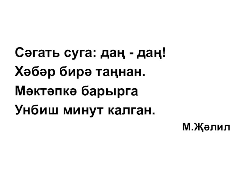 Сәгать суга: даң - даң!Хәбәр бирә таңнан.Мәктәпкә барыргаУнбиш минут калган.М.Җәлил