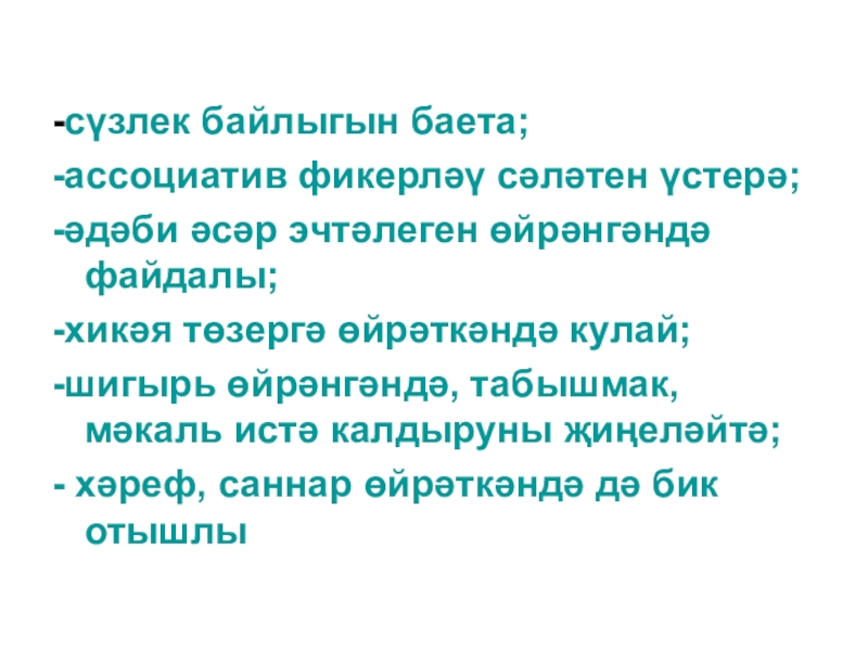 -сүзлек байлыгын баета;-ассоциатив фикерләү сәләтен үстерә; -әдәби әсәр эчтәлеген өйрәнгәндә файдалы;-хикәя төзергә өйрәткәндә кулай;-шигырь өйрәнгәндә, табышмак, мәкаль