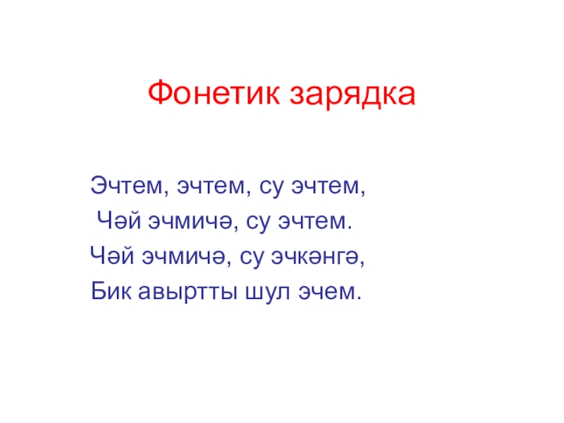 Фонетик зарядкаЭчтем, эчтем, су эчтем, Чәй эчмичә, су эчтем.Чәй эчмичә, су эчкәнгә, Бик авыртты шул эчем.