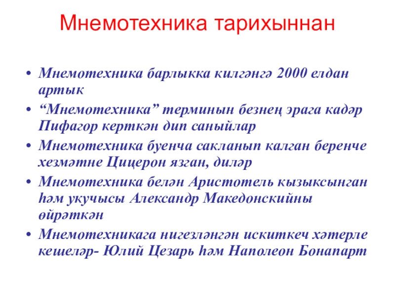 Мнемотехника тарихыннан Мнемотехника барлыкка килгәнгә 2000 елдан артык“Мнемотехника” терминын безнең эрага кадәр Пифагор керткән дип саныйларМнемотехника буенча