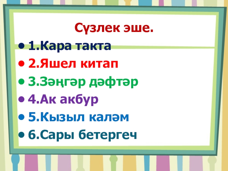 Сүзлек эше.1.Кара такта2.Яшел китап3.Зәңгәр дәфтәр4.Ак акбур5.Кызыл каләм6.Сары бетергеч