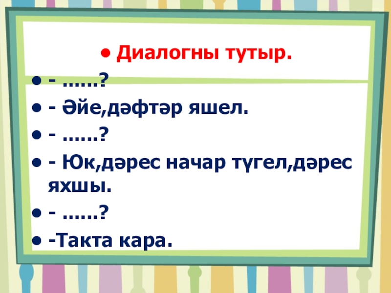 Диалогны тутыр.- ......?- Әйе,дәфтәр яшел.- ......?- Юк,дәрес начар түгел,дәрес яхшы.- ......?-Такта кара.
