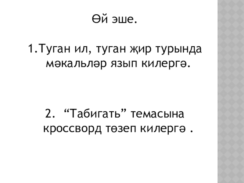 Өй эше.1.Туган ил, туган җир турында мәкальләр язып килергә.2. “Табигать” темасына кроссворд төзеп килергә .