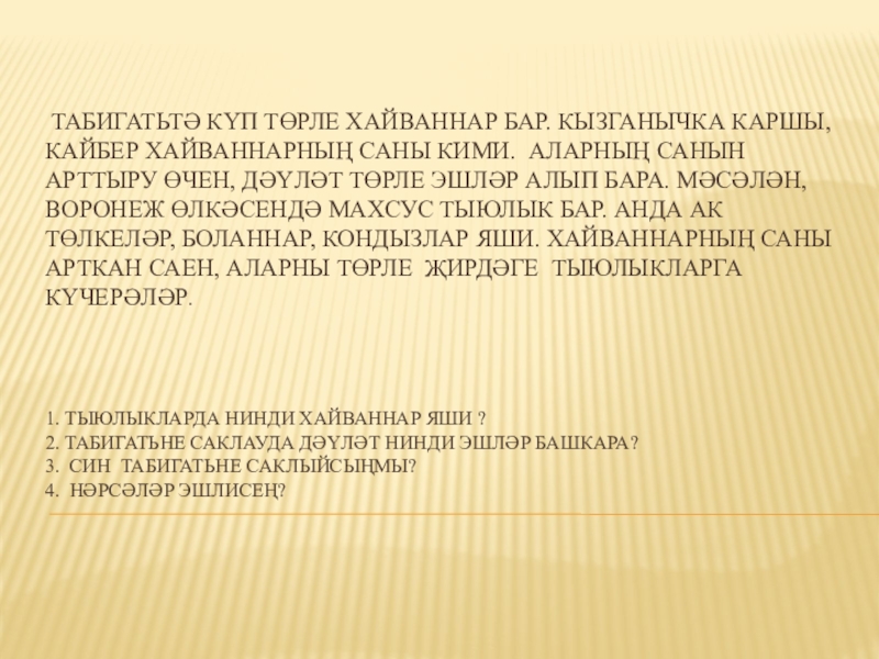 саны кими. Аларның санын арттыру өчен, дәүләт төрле эшләр алып бара. Мәсәлән, воронеж өлкәсендә махсус тыюлык бар. анда ак төлкеләр, боланнар, кондызлар яши. Хайваннарның саны арткан саен, аларны төрле җирдәге тыюлыкларга күчерәләр. 1. Тыюлыкларда нинди хайваннар яши ? 2. Табигатьне саклауда дәүләт нинди эшләр башкара? 3. Син Табигатьне саклыйсыңмы? 4. Нәрсәләр эшлисең?
