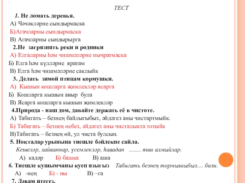 ТЕСТ  1. Не ломать деревья. А) Чәчәкләрне сындырмаска Б)Агачларны сындырмаска В) Агачларны сындырырга  2.Не загрязнять реки